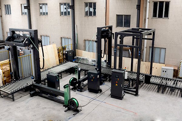瓦楞紙板捆扎纏繞包裝線2臺(tái)頂壓式托盤穿劍捆扎機(jī)、1臺(tái)搖臂式纏繞包裝機(jī)以及若干滾筒輸送機(jī)組成。針對(duì)瓦楞紙板比較蓬松的特性,該線體配備了帶下壓功能的托盤捆扎機(jī),最大壓力可達(dá)500kg,有效降低包裝體積,同時(shí)讓包裝物更加緊實(shí),防止運(yùn)輸過程中的散落。